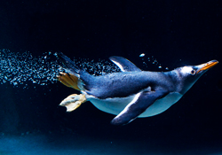Gentoo Penguins, the third largest penguin species, are known to be the most curious of all penguins. Their roommates, the Macaroni Penguins, are excellent climbers and are known as the “alpine penguin” because they will scale cliff faces just to find the perfect nesting areas. Both types of penguins love to "fly" using their strong, heavy wing bones that make it easy to propel through the water.