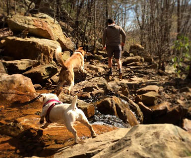 Water is often a deciding factor in whether a trail is a dog favorite. Blane Andrews agrees that the trails near Cravens House are convenient for both long and short runs. But afterwards, his dogs Willow and Dallas are always eager to stop by Glen Falls for a swim. “The dogs and I like to go to places with lots of natural water sources,” Andrews says. The North Chick Gorge is another favorite. “Willow likes to skip all the nonsense going on at the Blue Hole, and go a couple of more miles in for the less populated watering holes,” she says.